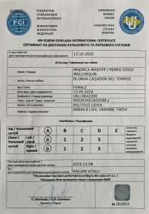 Energetic and charismatic, she shows great enthusiasm and presence in the ring, always attracting attention with her natural confidence and expression. Her powerful chest, well-developed muscles, and graceful movement perfectly reflect the true type of the Ca de Bou breed.